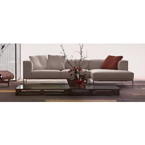 Ecksofa Moov design von Piero Lissoni für Cassina mit Arm- und Rückenlehnen mit Innenstruktur aus Stahl und expandiertem, FCKW-freiem Polyurethan sowie Einsätze mit verschiedener Dichte und Polsterfüllung aus Polyesterwatte; die gepolsterten Elemente ruhen auf einer Fläche aus Mehrschicht-Pappelholz, der Bezug ist aus Stoff oder Leder, der Unterbau aus Stahl. Die Füßchen aus Aluminium-Pressguss haben einen dreieckigen Querschnitt und sind in den Ausführungen glanzgebürstet, schwarz, oder weiß mattlackiert erhältlich. Sie sind mit Präzision an den Enden des Sofas angebracht.