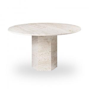 Tisch Epic design von GamFratesi für Gubi mit Platte und Sockel aus Travertinstein oder mit Stahlplatten, verzinkt und in zwei Ausführungen lackiert.