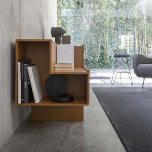 Ella se caracteriza por líneas esenciales y geométricas que expresan una estética fuertemente minimalista y escultórica. Las diferentes secciones y volúmenes crean un juego compositivo que aporta mayor profundidad visual a todo el aparador, equilibrando la funcionalidad con el diseño arquitectónico. Su silueta geométrica y definida representa además una interpretación contemporánea y dinámica del concepto de almacenamiento, convirtiéndolo en una pieza de fuerte impacto visual.